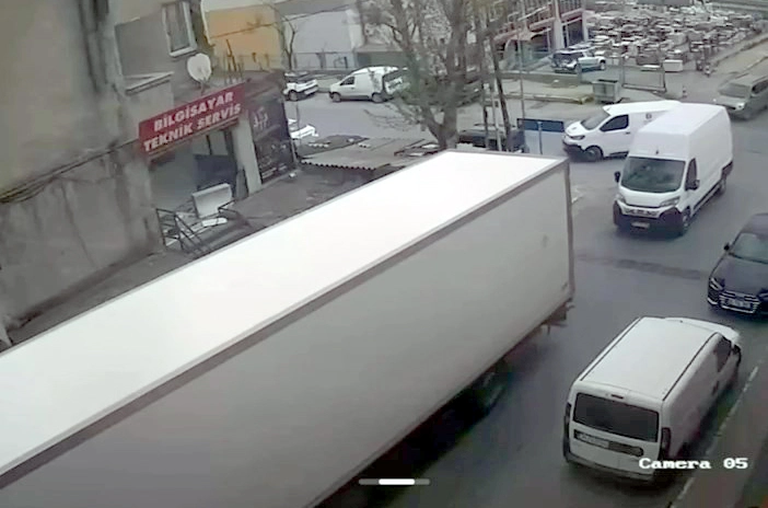 Yakuplu Mahallesi'nde dün öğle saatlerinde iddiaya göre bir TIR şoförü araçtan inerken el frenini çekmeyi unuttu. Araç geriye doğru kaymaya başladı. Şoför, aracın hareketlendiğini görünce koşup, müdahale etmek istedi. Ancak, aracın hızına yetişemedi. TIR'ın dorsesi, arkasındaki kapalı kasa minibüse çarptı. Şans eseri yaralanan kimsenin olmadığı kaza, bir iş yerinin güvenlik kamerasına yansıdı.