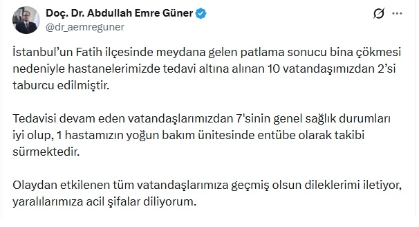 İstanbul İl Sağlık Müdürü Doç. Dr. Abdullah Emre Güner, sanal medya hesabından yaptığı açıklamada, "İstanbul’un Fatih ilçesinde meydana gelen patlama sonucu bina çökmesi nedeniyle hastanelerimizde tedavi altına alınan 10 vatandaşımızdan 2’si taburcu edilmiştir. Tedavisi devam eden vatandaşlarımızdan 7'sinin genel sağlık durumları iyi olup, 1 hastamızın yoğun bakım ünitesinde entübe olarak takibi sürmektedir. Olaydan etkilenen tüm vatandaşlarımıza geçmiş olsun dileklerimi iletiyor, yaralılarımıza acil şifalar diliyorum." ifadelerine yer verdi. (DHA)