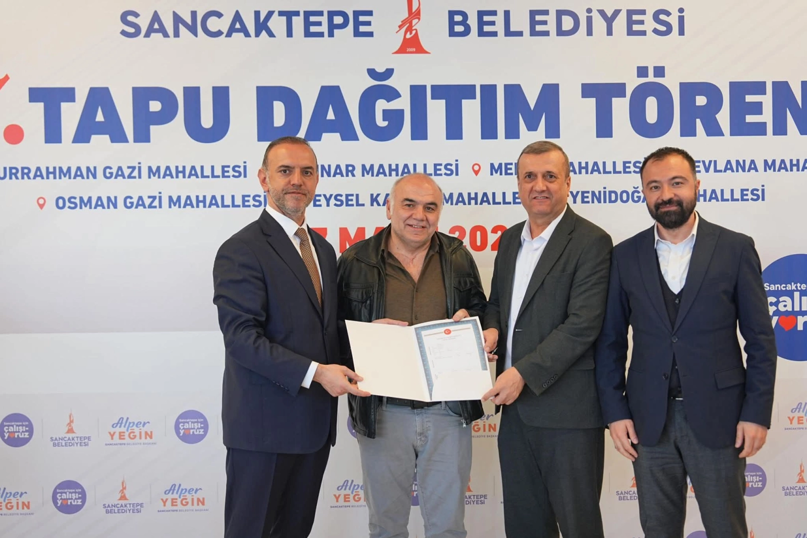 Sancaktepe Belediye Başkanı Alper Yeğin, görev süresi boyunca 7.kez tapu dağıtımını gerçekleştirdiklerini ve amaçlarının tapu sorunundan arınmış bir Sancaktepe olduğunun altını çizerek "Amacımız tapu sorunu çözüme kavuşturup gündemimizden çıkarmaktır. Bugün 54 hak sahibi vatandaşımız tapularına kavuştular tapu dağıtımları önümüzdeki günlerde de devam edecek. Sancaktepe'de tapusuz mülk kalmayacak. Sancaktepe'de ikamet eden her komşumuz kendi tapulu mülklerinde oturmuş olacak" dedi.