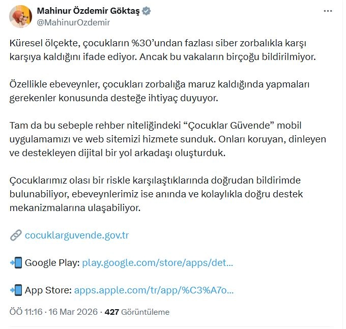 Aile ve Sosyal Hizmetler Bakanı Mahinur Özdemir Göktaş, sanal medya hesabından yaptığı açıklamada, "Küresel ölçekte, çocukların yüzde 30'undan fazlası siber zorbalıkla karşı karşıya kaldığını ifade ediyor. Ancak bu vakaların birçoğu bildirilmiyor. Özellikle ebeveynler, çocukları zorbalığa maruz kaldığında yapmaları gerekenler konusunda desteğe ihtiyaç duyuyor. Tam da bu sebeple rehber niteliğindeki 'Çocuklar Güvende' mobil uygulamamızı ve web sitemizi hizmete sunduk. Onları koruyan, dinleyen ve destekleyen dijital bir yol arkadaşı oluşturduk. Çocuklarımız olası bir riskle karşılaştıklarında doğrudan bildirimde bulunabiliyor, ebeveynlerimiz ise anında ve kolaylıkla doğru destek mekanizmalarına ulaşabiliyor" ifadelerini kullandı. (DHA)