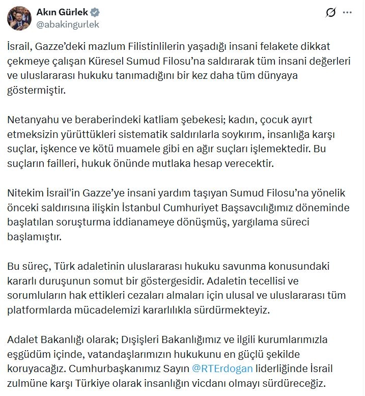 Adalet Bakanı Akın Gürlek, sanal medya hesabından yaptığı açıklamada, "İsrail, Gazze’deki mazlum Filistinlilerin yaşadığı insani felakete dikkat çekmeye çalışan Küresel Sumud Filosu’na saldırarak tüm insani değerleri ve uluslararası hukuku tanımadığını bir kez daha tüm dünyaya göstermiştir. Netanyahu ve beraberindeki katliam şebekesi; kadın, çocuk ayırt etmeksizin yürüttükleri sistematik saldırılarla soykırım, insanlığa karşı suçlar, işkence ve kötü muamele gibi en ağır suçları işlemektedir. Bu suçların failleri, hukuk önünde mutlaka hesap verecektir. Nitekim İsrail'in Gazze’ye insani yardım taşıyan Sumud Filosu’na yönelik önceki saldırısına ilişkin İstanbul Cumhuriyet Başsavcılığımız döneminde başlatılan soruşturma iddianameye dönüşmüş, yargılama süreci başlamıştır. Bu süreç, Türk adaletinin uluslararası hukuku savunma konusundaki kararlı duruşunun somut bir göstergesidir. Adaletin tecellisi ve sorumluların hak ettikleri cezaları almaları için ulusal ve uluslararası tüm platformlarda mücadelemizi kararlılıkla sürdürmekteyiz. Adalet Bakanlığı olarak; Dışişleri Bakanlığımız ve ilgili kurumlarımızla eşgüdüm içinde, vatandaşlarımızın hukukunu en güçlü şekilde koruyacağız. Cumhurbaşkanımız Sayın Recep Tayyip Erdoğan liderliğinde İsrail zulmüne karşı Türkiye olarak insanlığın vicdanı olmayı sürdüreceğiz" ifadelerini kullandı. (DHA)