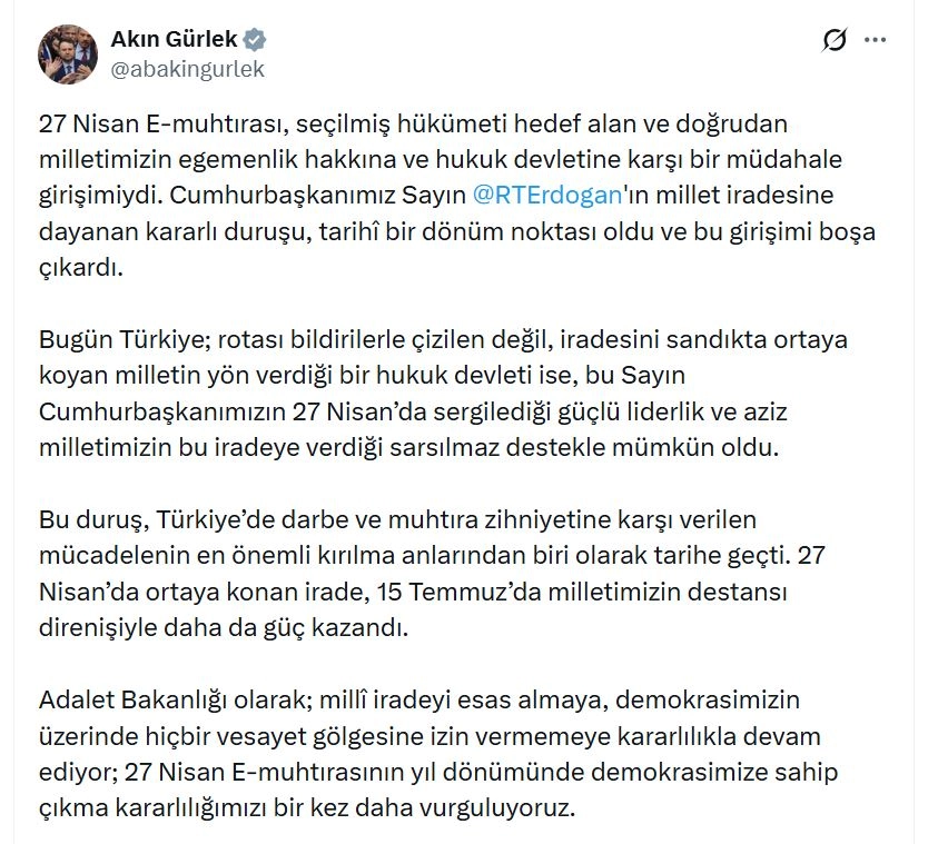Bakan Gürlek, sanal medya hesabından yaptığı açıklamada, "27 Nisan e-muhtırası, seçilmiş hükümeti hedef alan ve doğrudan milletimizin egemenlik hakkına ve hukuk devletine karşı bir müdahale girişimiydi. Cumhurbaşkanımız Sayın Recep Tayyip Erdoğan'ın millet iradesine dayanan kararlı duruşu, tarihi bir dönüm noktası oldu ve bu girişimi boşa çıkardı. Bugün Türkiye; rotası bildirilerle çizilen değil, iradesini sandıkta ortaya koyan milletin yön verdiği bir hukuk devleti ise, bu Sayın Cumhurbaşkanımızın 27 Nisan'da sergilediği güçlü liderlik ve aziz milletimizin bu iradeye verdiği sarsılmaz destekle mümkün oldu. Bu duruş, Türkiye'de darbe ve muhtıra zihniyetine karşı verilen mücadelenin en önemli kırılma anlarından biri olarak tarihe geçti. 27 Nisan’da ortaya konan irade, 15 Temmuz’da milletimizin destansı direnişiyle daha da güç kazandı" ifadelerini kullandı.