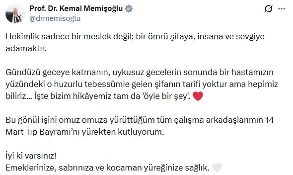 Bakan Memişoğlu, sanal medya hesabından yaptığı paylaşımda, "Hekimlik sadece bir meslek değil; bir ömrü şifaya, insana ve sevgiye adamaktır. Gündüzü geceye katmanın, uykusuz gecelerin sonunda bir hastamızın yüzündeki o huzurlu tebessümle gelen şifanın tarifi yoktur ama hepimiz biliriz. İşte bizim hikayemiz tam da öyle bir şey. Bu gönül işini omuz omuza yürüttüğüm tüm çalışma arkadaşlarımın 14 Mart Tıp Bayramı’nı yürekten kutluyorum. İyi ki varsınız. Emeklerinize, sabrınıza ve kocaman yüreğinize sağlık" dedi. (DHA)