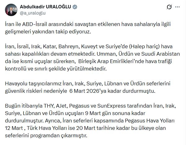 Bakan Uraloğlu, sanal medya hesabından yaptığı açıklamada, "İran ile ABD-İsrail arasındaki savaştan etkilenen hava sahalarıyla ilgili gelişmeleri yakından takip ediyoruz. İran, İsrail, Irak, Katar, Bahreyn, Kuveyt ve Suriye’de (Halep hariç) hava sahası kapalılıkları devam etmektedir. Umman, Ürdün ve Suudi Arabistan da ise kısmi uçuşlar sürerken, Birleşik Arap Emirlikleri’nde (BAE) hava trafiği kontrollü ve sınırlı şekilde yürütülmektedir. Havayolu taşıyıcılarımız İran, Irak, Suriye, Lübnan ve Ürdün seferlerini güvenlik riskleri nedeniyle 6 Mart 2026’ya kadar durdurmuştu. Bugün itibarıyla THY, AJet, Pegasus ve SunExpress tarafından İran, Irak, Suriye, Lübnan ve Ürdün uçuşları 9 Mart gün sonuna kadar durdurulmuştur. Ayrıca, İran seferleri kapsamında Pegasus Hava Yolları 12 Mart, Türk Hava Yolları ise 20 Mart tarihine kadar bu ülkeye olan seferlerini programdan çıkarmıştır" dedi.