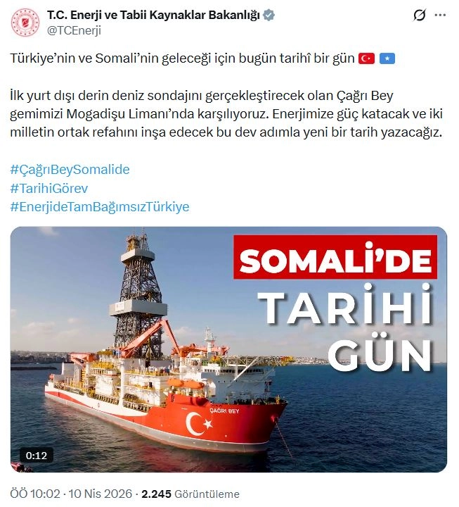 ANKARA, (DHA)- ENERJİ ve Tabii Kaynaklar Bakanlığı, Türkiye'nin ilk yurt dışı derin deniz sondajını gerçekleştirecek Çağrı Bey gemisinin Somali'nin Mogadişu Limanı'nda karşılanmasıyla ilgili paylaşım yaptı.