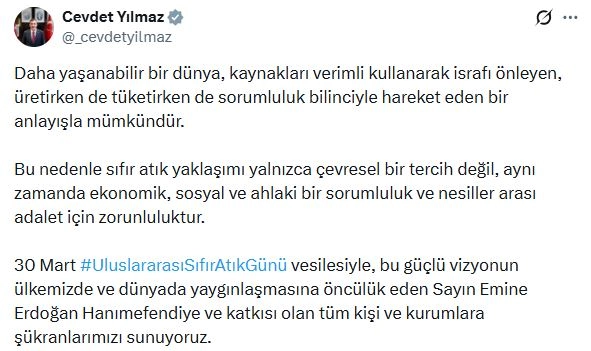 Cumhurbaşkanı Yardımcısı Cevdet Yılmaz, sanal medya hesabından paylaştığı mesajda, "Daha yaşanabilir bir dünya, kaynakları verimli kullanarak israfı önleyen, üretirken de tüketirken de sorumluluk bilinciyle hareket eden bir anlayışla mümkündür. Bu nedenle Sıfır Atık yaklaşımı yalnızca çevresel bir tercih değil, aynı zamanda ekonomik, sosyal ve ahlaki bir sorumluluk ve nesiller arası adalet için zorunluluktur. 30 Mart Uluslararası Sıfır Atık Günü vesilesiyle, bu güçlü vizyonun ülkemizde ve dünyada yaygınlaşmasına öncülük eden Sayın Emine Erdoğan Hanımefendi'ye ve katkısı olan tüm kişi ve kurumlara şükranlarımızı sunuyoruz" dedi. (DHA)