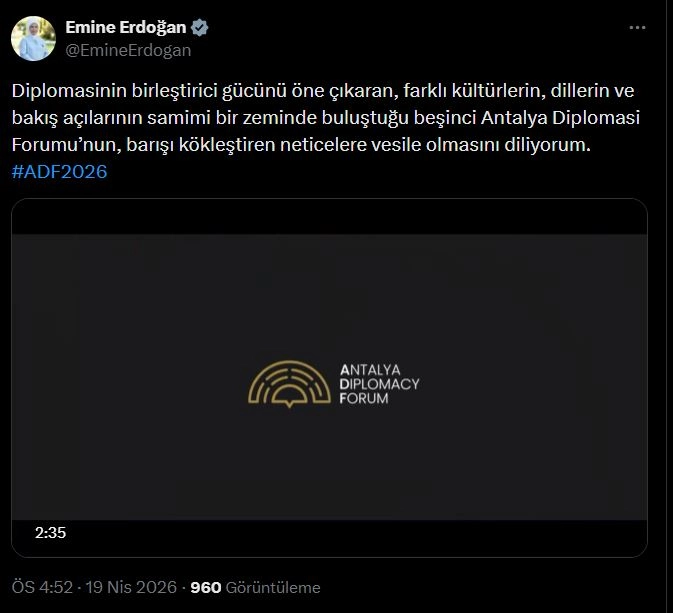Emine Erdoğan'dan 5'inci Antalya Diplomasi Forumu'na ilişkin paylaşım
