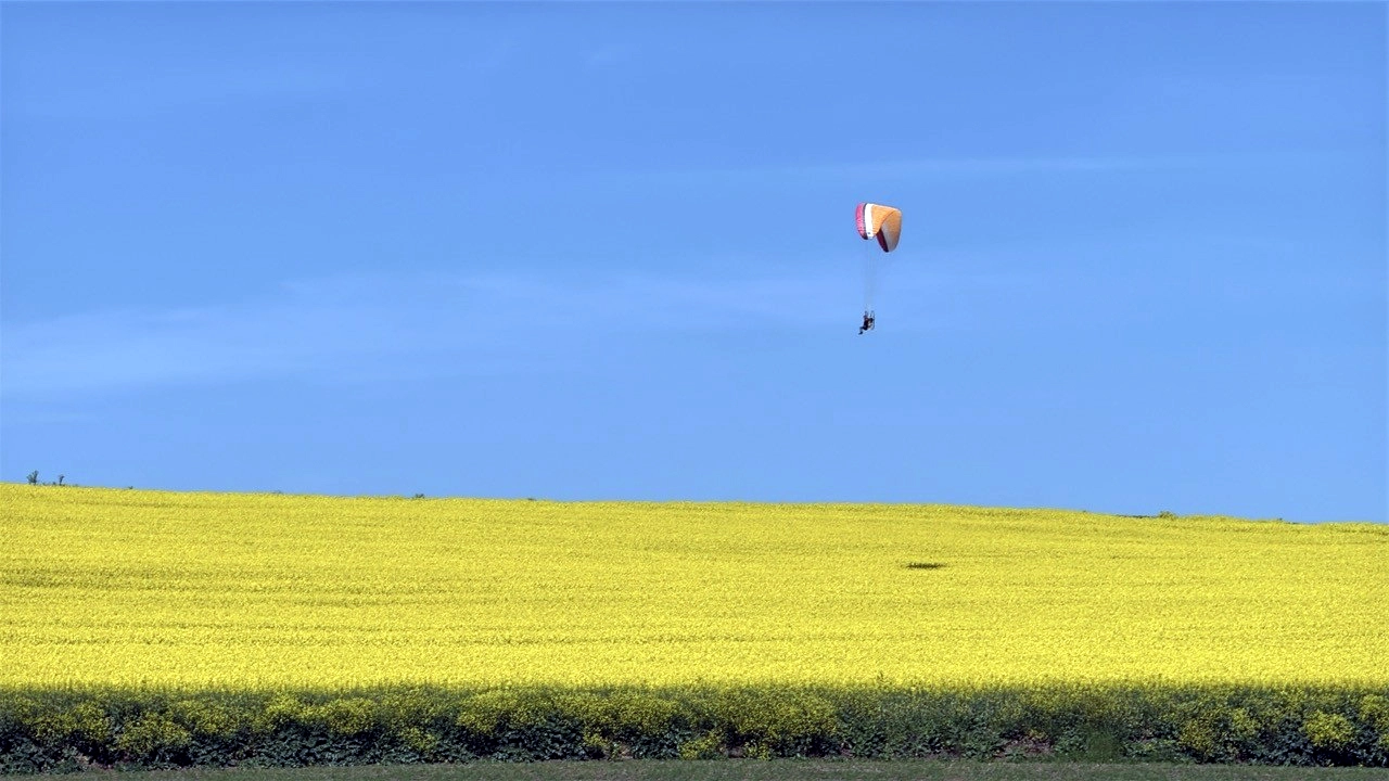 Abdullah YALÇIN / TEKİRDAĞ, (DHA)- TEKİRDAĞ’da paraşüt eğitmeni Kadir Aksoy, sarı renge bürünen kanola tarlaları üzerinde paramotorla uçtu.